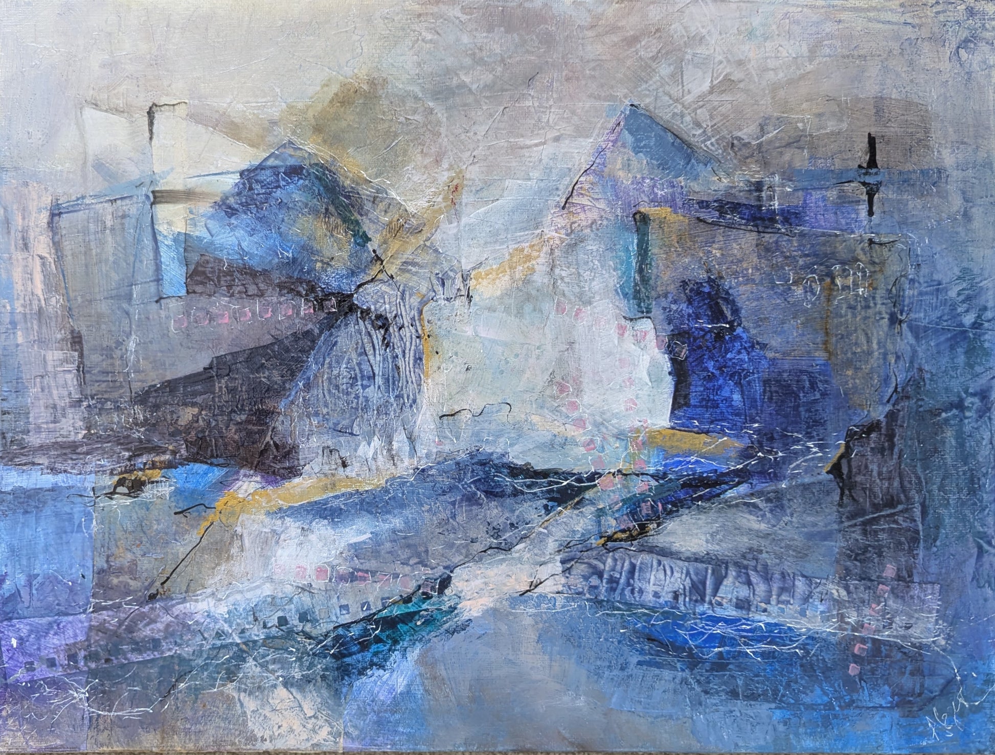 acrylic, collage, markers, ink on cardboard panel 12"x16"